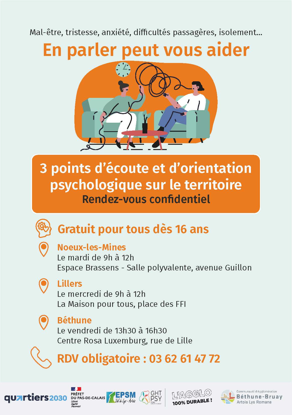 En cas de détresse psychologique, de mal-être, de difficultés personnelles ou familiales... Trois points d’écoute et d’orientation psychologique sont à votre disposition de façon gratuite, pour les plus de 16 ans, à Lillers, Béthune et Nœux-les-Mines :