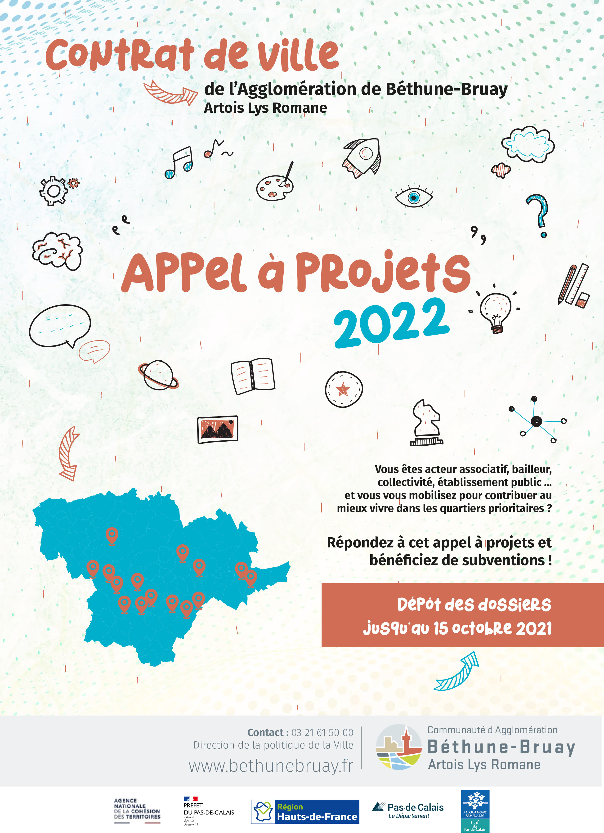 Chaque année, la Communauté d’Agglomération et l’Etat, en partenariat avec la Région Hauts-de-France, le Département du Pas-de-Calais et la Caisse d’Allocations Familiales du Pas-de-Calais, proposent aux opérateurs souhaitant œuvrer à la transformation sociale, économique et urbaine des quartiers prioritaires de la Politique de la Ville de répondre à l’appel à projets du Contrat de Ville.