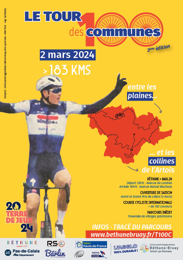 Le cyclisme est une tradition populaire sur notre territoire, qui compte déjà deux grands prix internationaux, à Lillers et Isbergues et qui attirent de nombreux passionnés et fidèles de la petite reine ! La volonté de la Communauté d’agglomération : que le tour des 100 communes devienne un autre rendez-vous sportif incontournable de notre territoire et participe à son rayonnement sportif et à son attractivité en fédérant, à chaque édition, un maximum de communes.