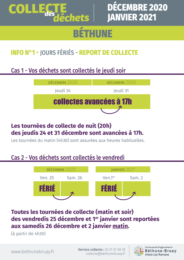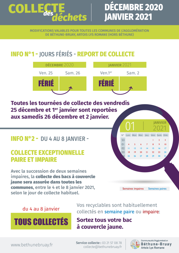 Collecte des déchets Collecte et jour férié, faisons le point ! Durant la période de fêtes de fin d'année, la collecte continue, en s'adaptant aux jours fériés ! Publié le 18 décembre 2020 Modifications valables pour toutes les communes de l’Agglomération de Béthune-Bruay, Artois Lys Romane (hors Béthune) Modifications valables pour Béthune Precedent Retour à la liste Suivant