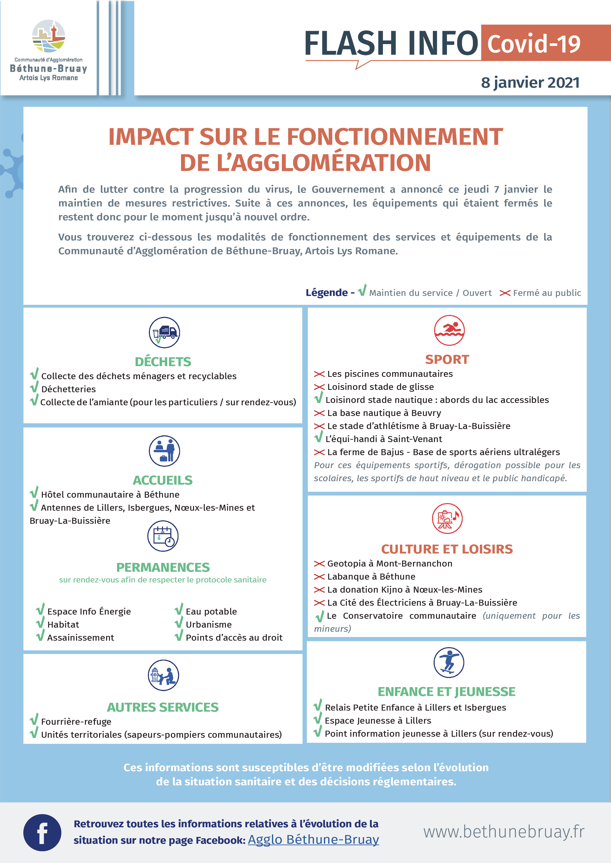 Retrouvez ci-dessous l'impact des mesures sanitaire sur les modalités de fonctionnement des services et équipements de l'Agglomération.