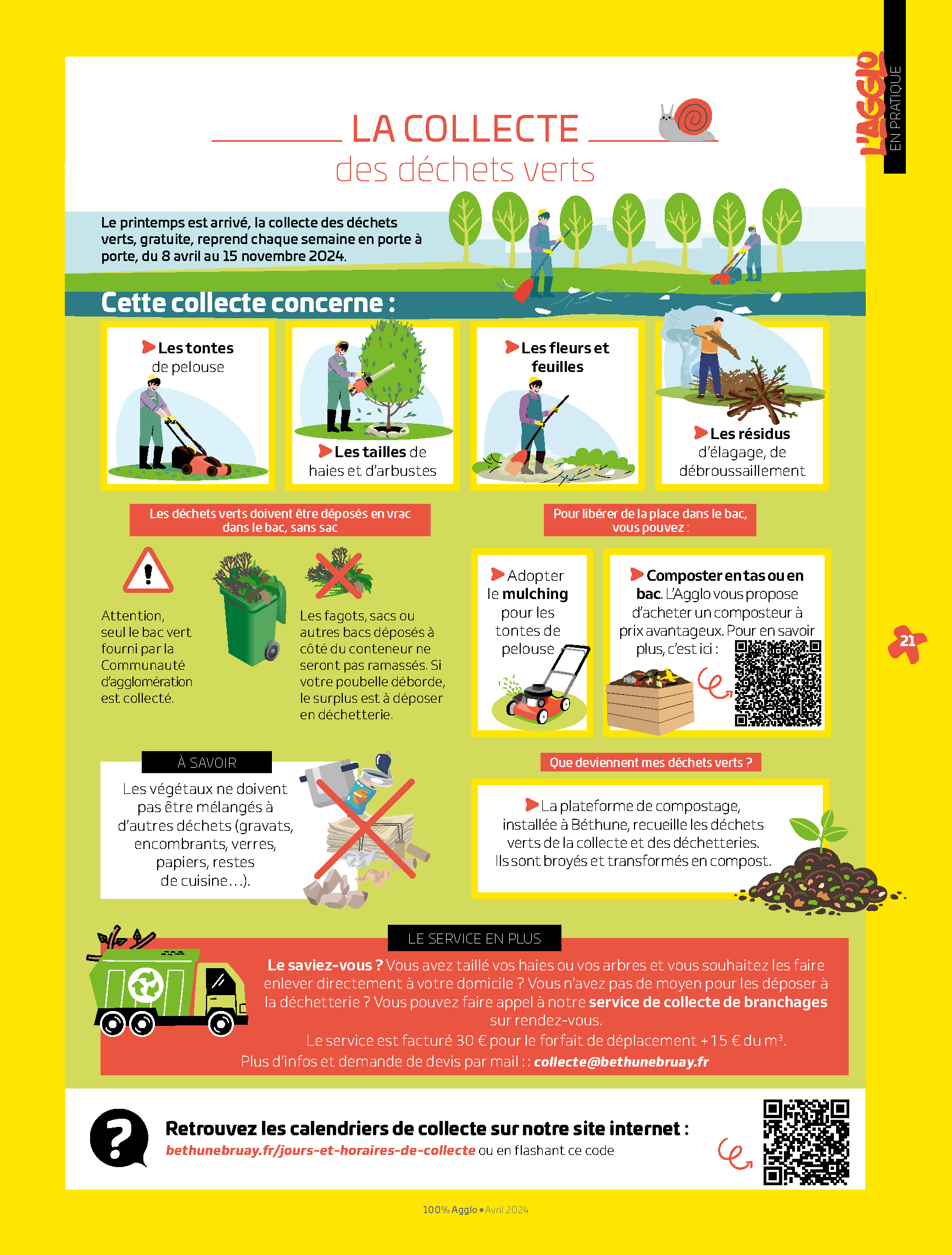 Cette collecte concerne : les tontes de pelouse, les tailles de haies et d'arbustes, les fleurs et feuilles et les résidus d'élagage et de débroussaillement.