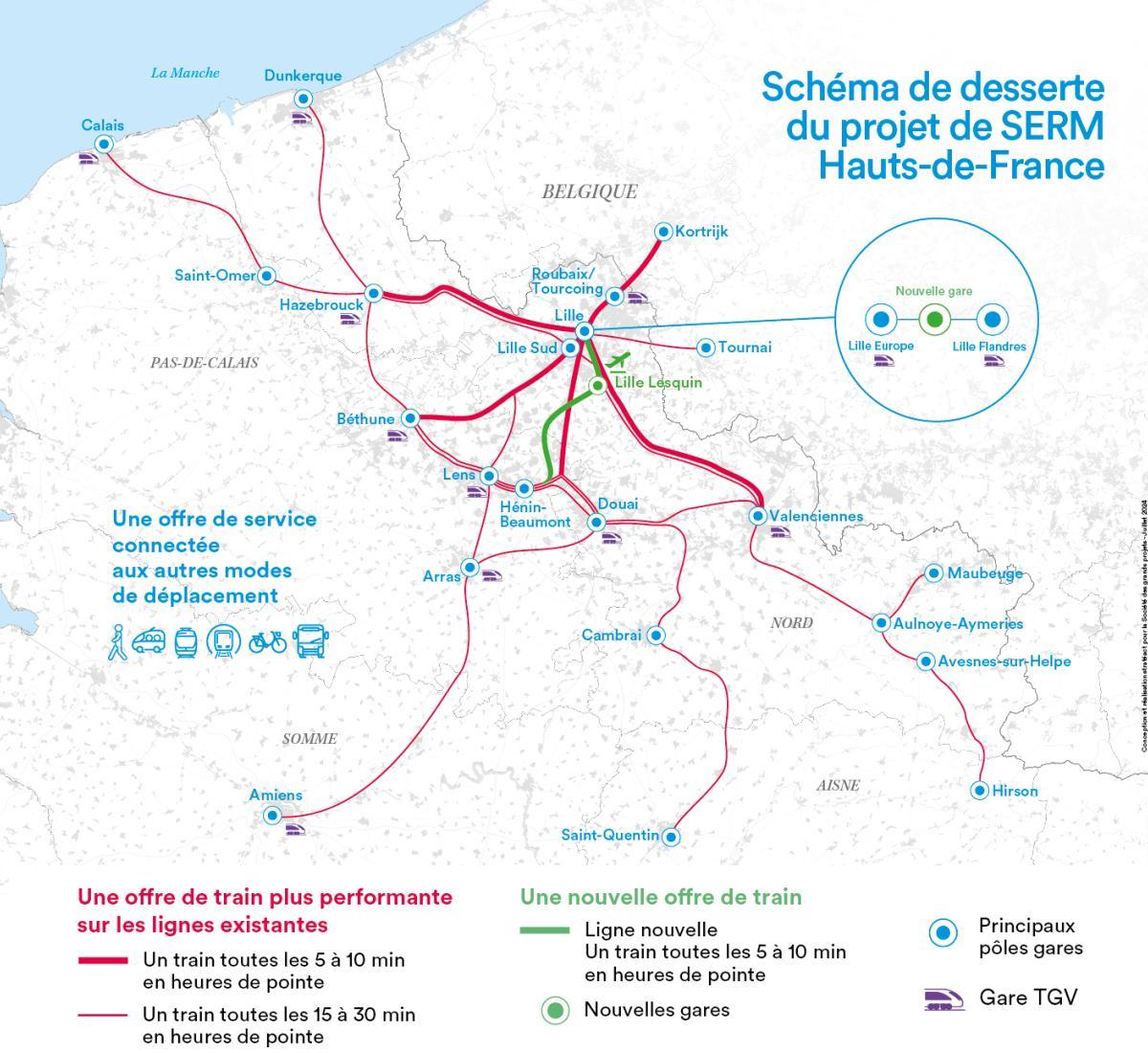 Le SERM Hauts-de-France est un service de mobilité multimodale dédié aux déplacements du quotidien, élaboré pour et avec les habitants et usagers. Il s’appuie prioritairement sur une augmentation du nombre de trains depuis et vers Lille et entre les pôles régionaux. Il rendra les gares plus accessibles grâce à une multiplication des modes de transport urbains et une desserte facilitée. L’objectif est d’améliorer les trajets grâce à des solutions fiables, efficaces et décarbonées.