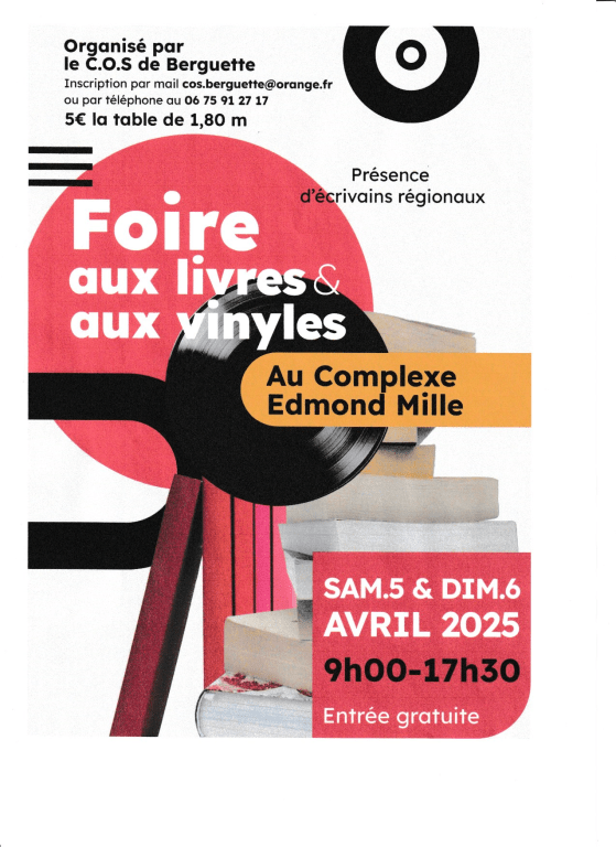 Le Comité des Oeuvres Sociales de Berguette (commune associée d'Isbergues) organise le 5 et 6 avril 2025 une foire aux livres et aux vinyles au complexe Edmond Mille rue Edmond Mille à Isbergues de 9H00 à 17H30. Entrée gratuite. Parking gratuit. Toilettes à l'intérieur avec accès aux PMR. Buvette et restauration sur place. Renseignements et inscription cos.berguette@orange.fr ou au 06 75 91 27 17