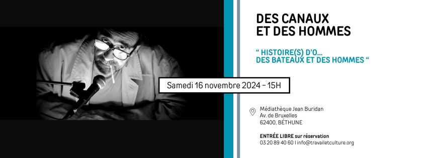 ➡️ SPECTACLE : Histoire(s) d’O… Des Bateaux et des Hommes (PARKOUR III) Création : Théâtre K Production : Travail et Culture En scène, Jean-Pierre Moult, nous fait vivre une expérience unique au cœur de la nuit, en nous jouant en direct de son studio radiophonique, l’histoire tantôt éthérée et tantôt charnelle, tantôt tendre et tantôt passionnée, qui sera l’aboutissement d’un parcours initiatique auquel le spectateur sera à son tour invité. Jean-Pierre Moult, cette fois, nous embarquera à bord de « l’imaginaire », une promenade et des rencontres avec entre autre Simon, éclusier, qui va nous permettre de découvrir et de comprendre les enjeux actuels liés à nos fleuves et canaux. Un voyage théâtral en amont et en aval d’un mode de vie singulier, rythmé par le cours d’eau et le bouillonnement des écluses, la vie au grand air, le compagnonnage, dont ce spectacle va témoigner. ➡️ ÉCHANGES : Avec l’équipe artistique En partenariat avec la Médiathèque Jean Buridan, soutenu par la Communauté d’agglomération de Béthune Bruay Artois Lys Romane Les informations pratiques : 📅 Spectacle à 15H, le samedi 16 novembre 2024 📍 Médiathèque Jean Buridan - BÉTHUNE 🎟️ Entrée libre sur réservation : Travail & Culture 03 20 89 40 60 / info@travailetculture.org