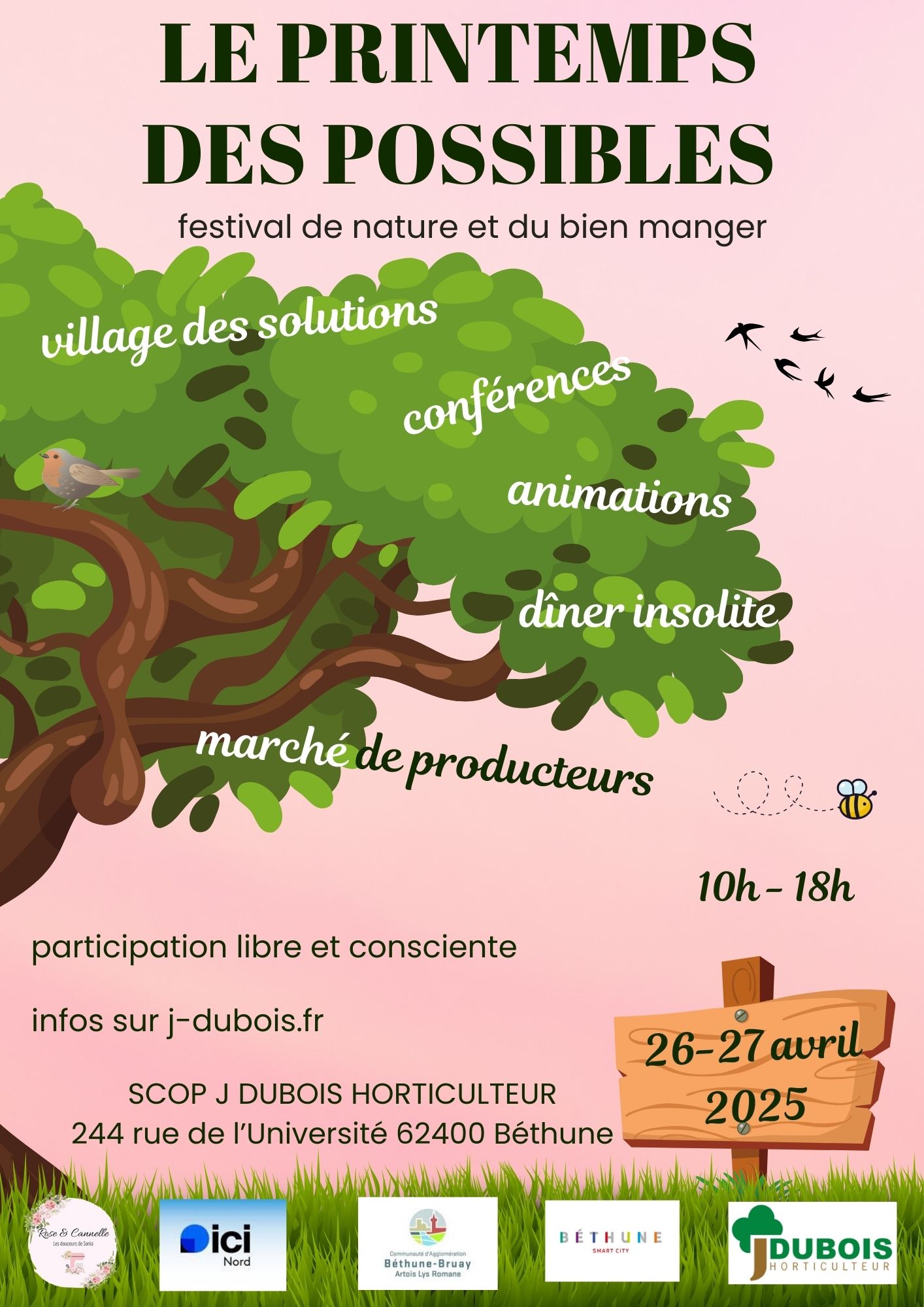 Du 26 Avr - 27 Avr SCOP J DUBOIS Horticulteur / Béthune 10h - 18h Événement Le printemps des possibles Festival de nature et du bien manger Ajouter au calendrier Public : Tout public Village des solutions Marché des producteurs Conférences et animations Dîner insolite Localiser Choice of plan Fermer Precedent Retour à la liste Suivant