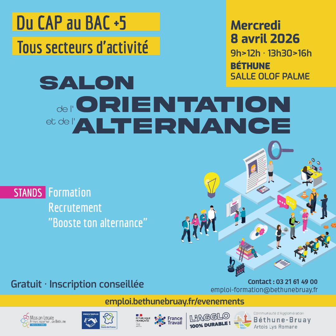 Le mercredi 8 avril 2026, la salle Olof Palme de Béthune accueille Le Salon de l'Orientation et de l'Alternance, un forum dédié à l’emploi et à la formation.