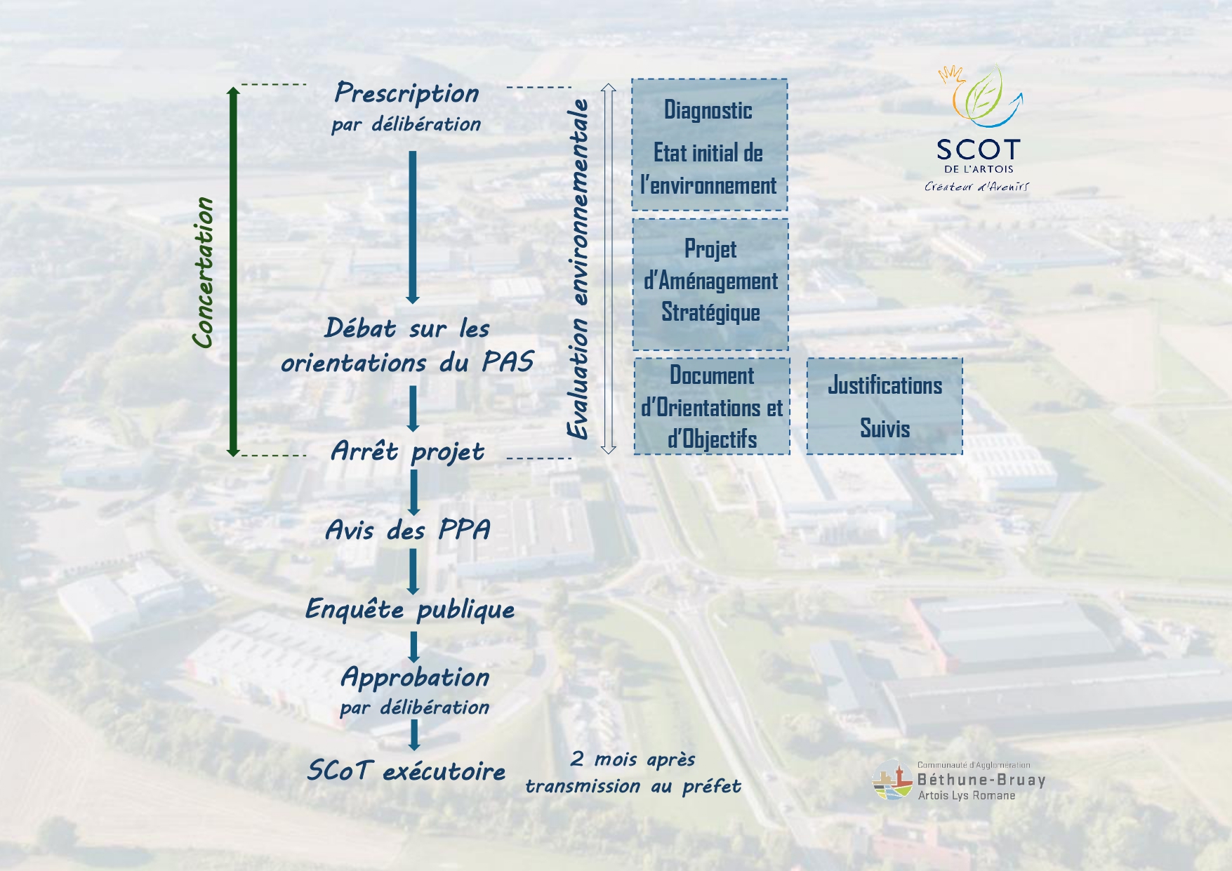Au regard des constats établis à la lumière de cette évaluation, des évolutions législatives et réglementaires, mais surtout des ambitions politiques pour le territoire, la Communauté d’agglomération de Béthune-Bruay, Artois Lys Romane a décidé d’engager la procédure de révision du SCoT de l’Artois par délibération du 27 septembre 2017.