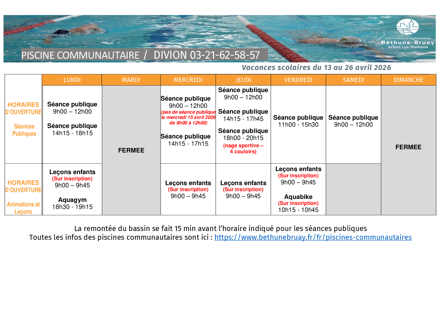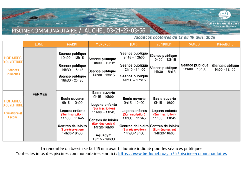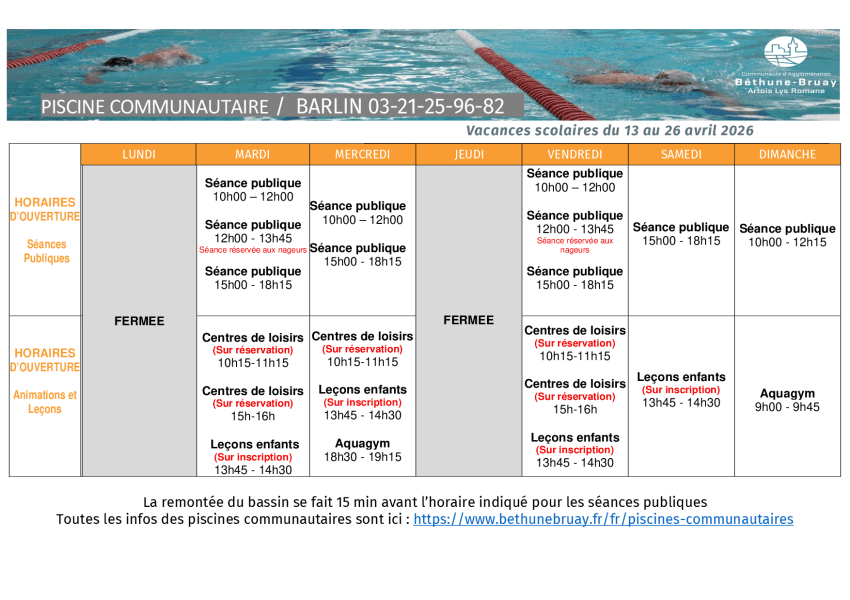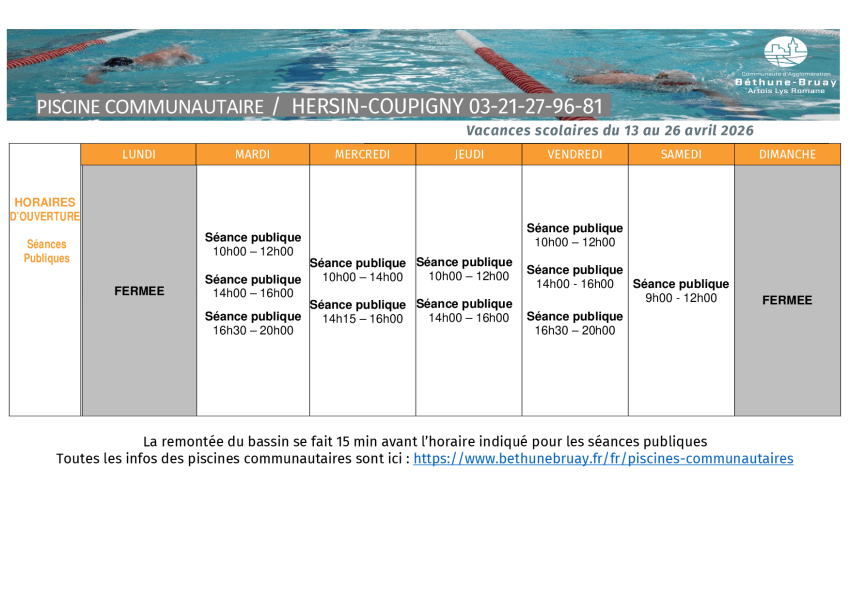 La piscine communautaire située à BRUAY-LA-BUISSIERE fermera ses portes le dimanche 28 septembre 2025 à 17h45 pour la saison hivernale.