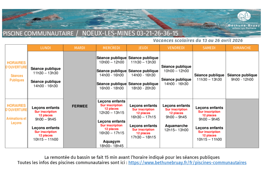 Les activités (Aquadouce, Aquabike et circuit training) seront suspendues à la piscine de NOEUX-LES-MINES du 6 juin au 3 juillet 2026, en raison de la mise en place de l'aisance aquatique et du parcours d'apprentissage destinés aux élèves des écoles maternelles.