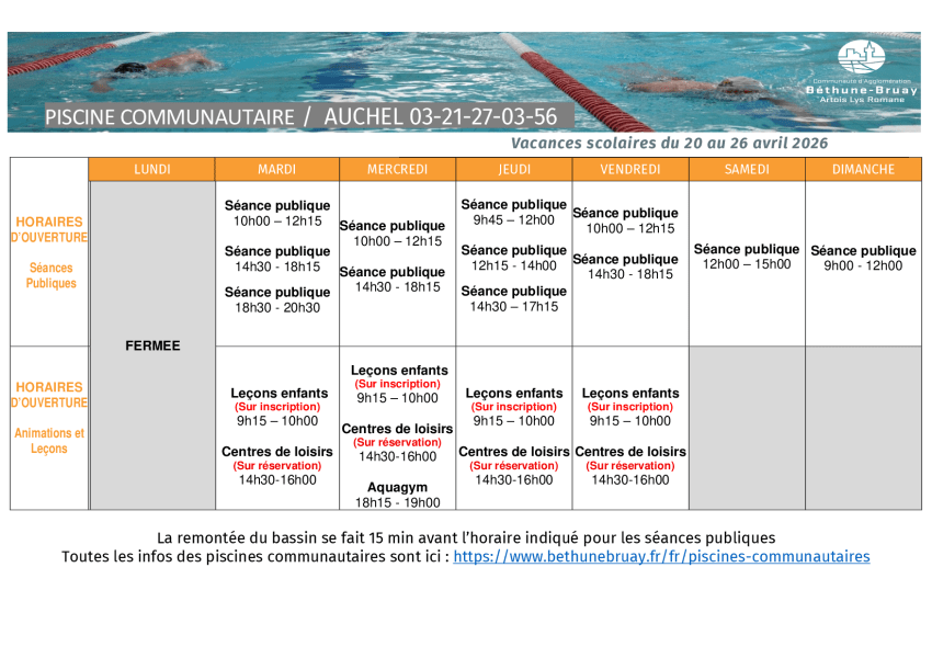Fermeture exceptionnelle de la piscine d'AUCHEL pour compétitions le dimanche 26 avril 2026 et le dimanche 31 mai 2026.