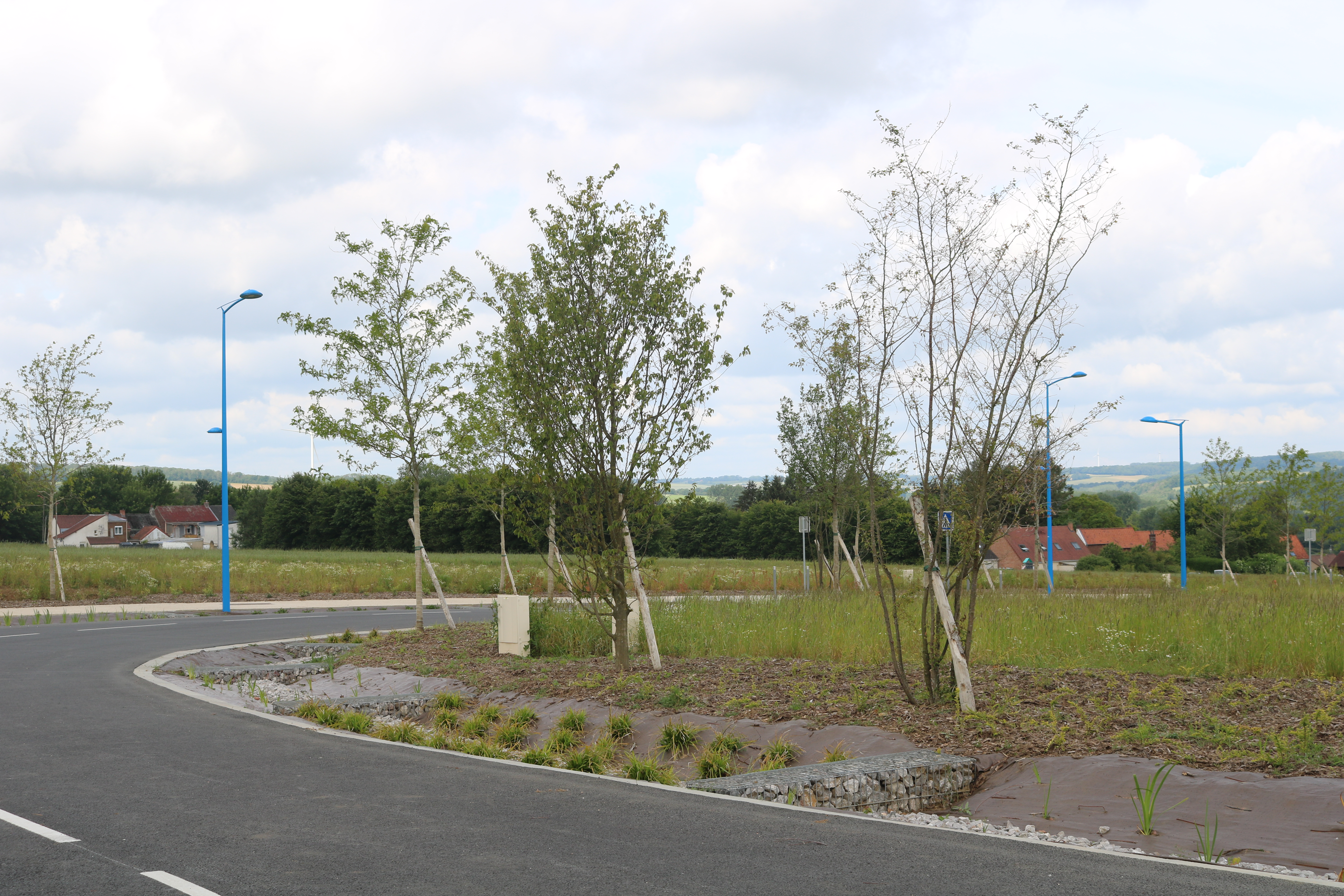 L’ensemble des aménagements permettent une bonne gestion des eaux pluviales grâce à l’intégration de noues dans la nouvelle voirie, celles-ci réduisent les risques d’inondation et préservent la qualité de l’eau. Ils assurent une bonne intégration dans le paysage et favorisent la préservation de la biodiversité, avec notamment un choix d’espèces végétales locales et mellifères, un enrobé recyclé à 40%, et des noues infiltrantes végétalisées…