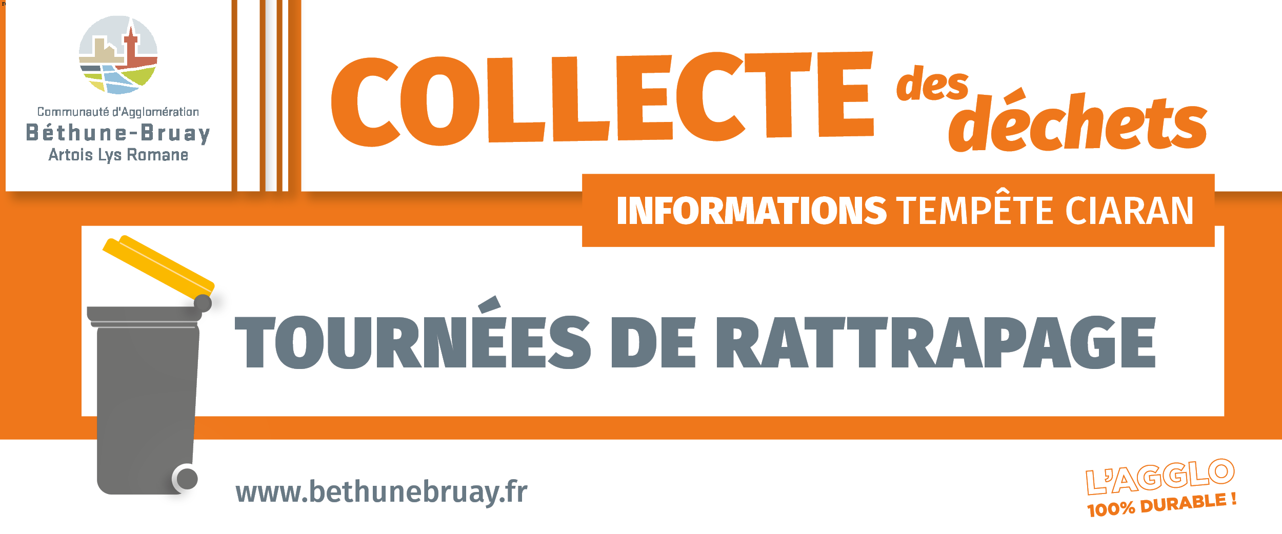 Les tournées de collecte des déchets verts et des déchets ménagers annulées ce jeudi 2 novembre ne seront pas rattrapées. Merci de patienter et de présenter vos bacs à la prochaine collecte.