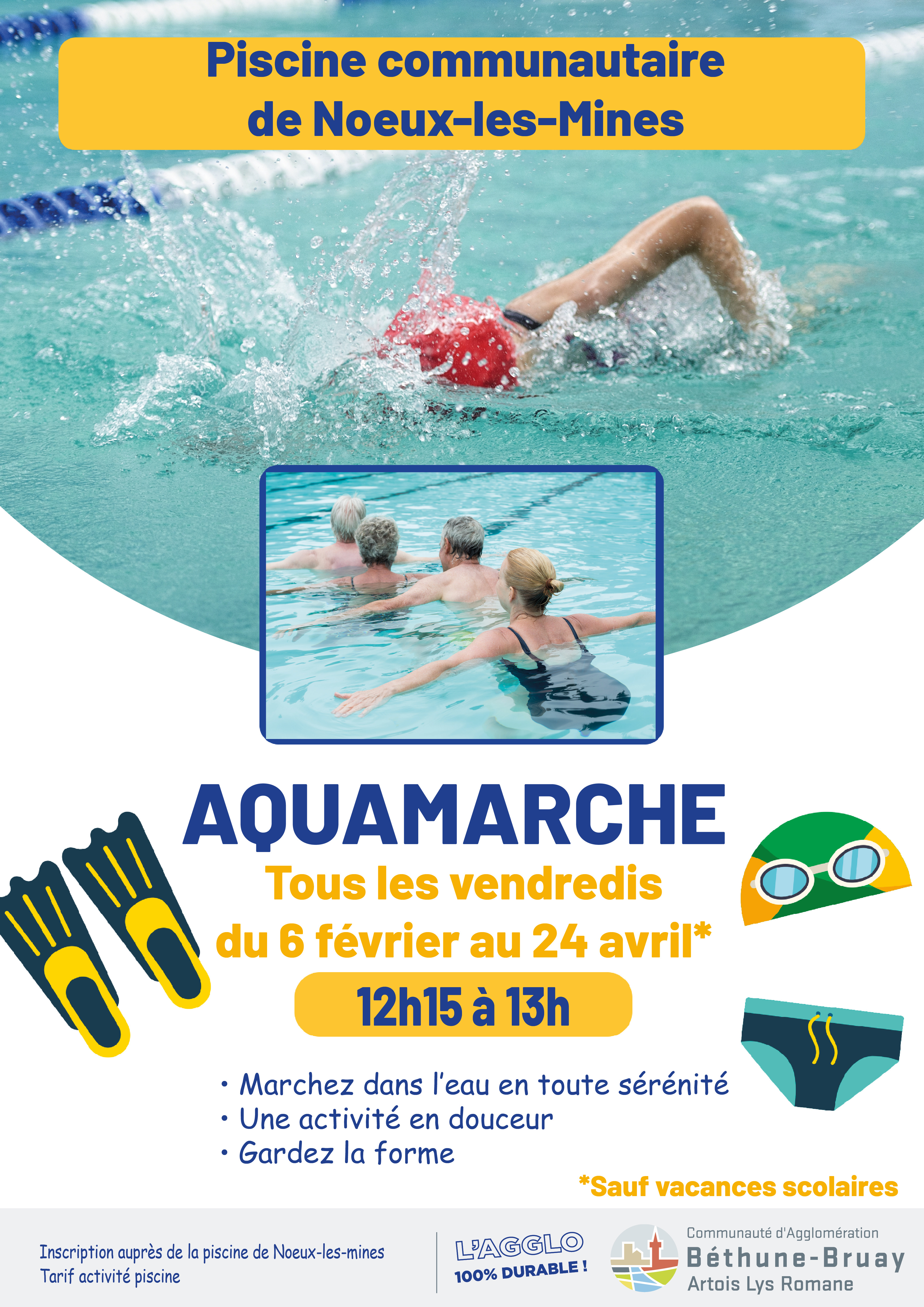 Venez découvrir l'aquamarche à la piscine de Noeux-les-Mines tous les vendredis* du 6 février 2026 au 24 avril 2026 de 12h15 à 13h.