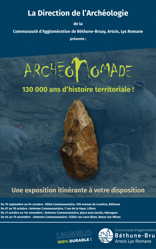 Ce sont pas moins de 57 objets issus du territoire, datant de la Préhistoire à l’époque Moderne, qui sont exposés dans une grande vitrine consacrée à l’archéologie territoriale. Complétée par 4 panneaux explicatifs et une carte, cette exposition, baptisée « Archéonomade », a vocation à voyager. Une façon de découvrir notre territoire autrement.